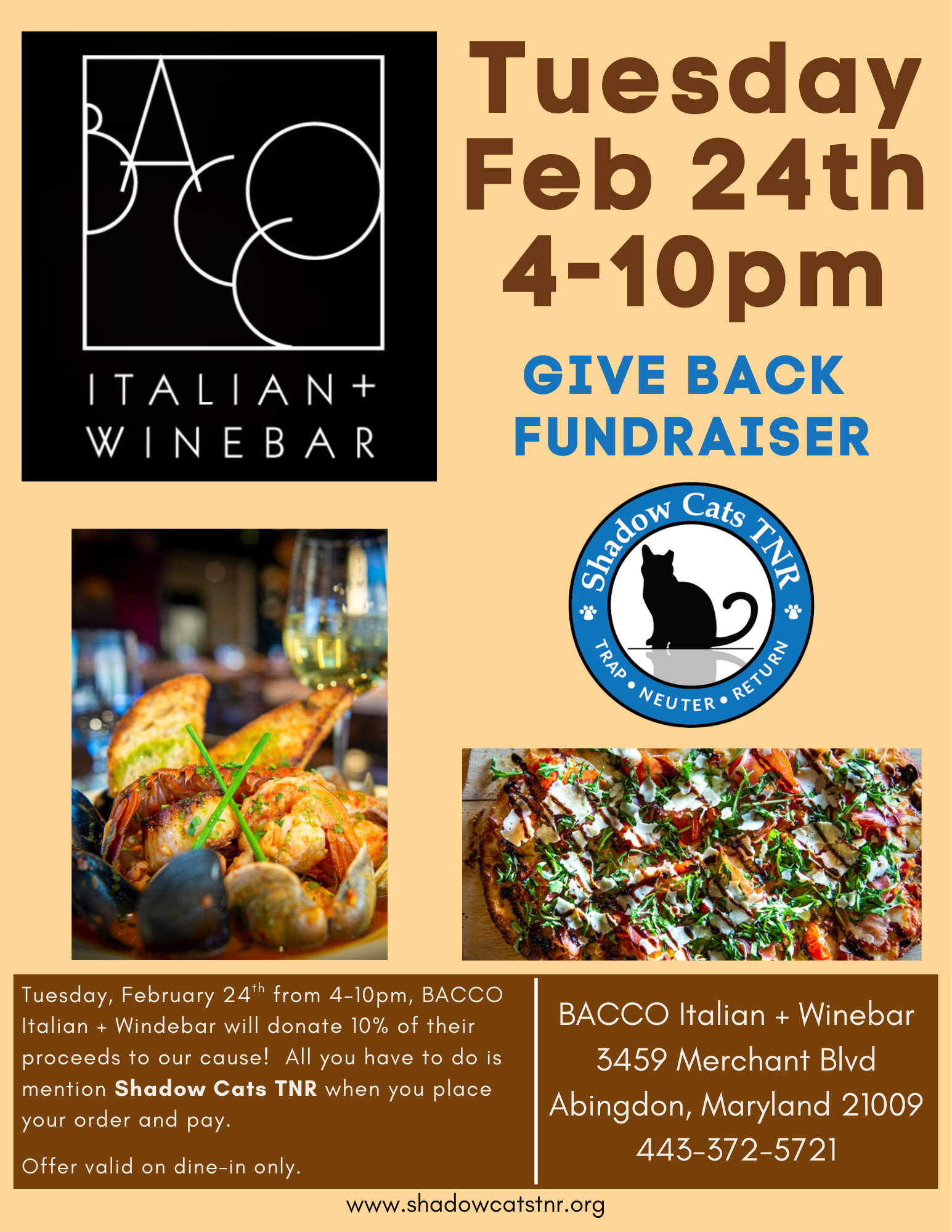 Tuesday, February 24th from 4-10pm, Bacco Italian + Winebar will donate 10% of their proceeds to our cause! All you have to do is mention Shadow Cats TNR when you place your order and pay.
